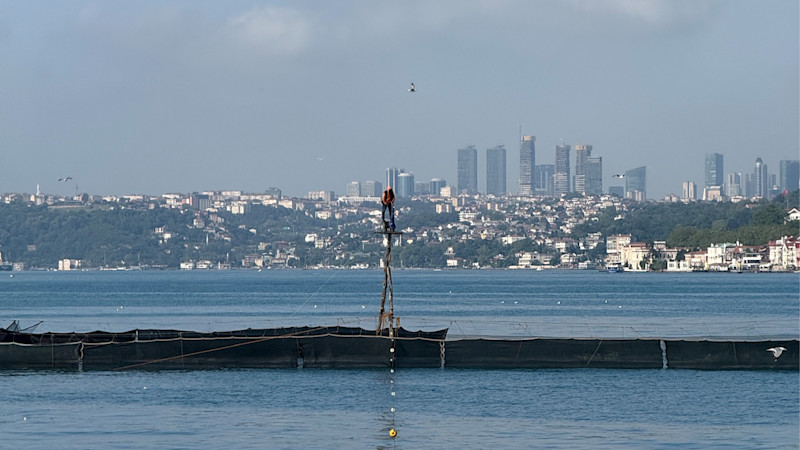 Beykoz Dalyan in practice, with its nets and poles, unfolds against a backdrop of a passing tanker and distant skyscrapers, displaying the coexistence.